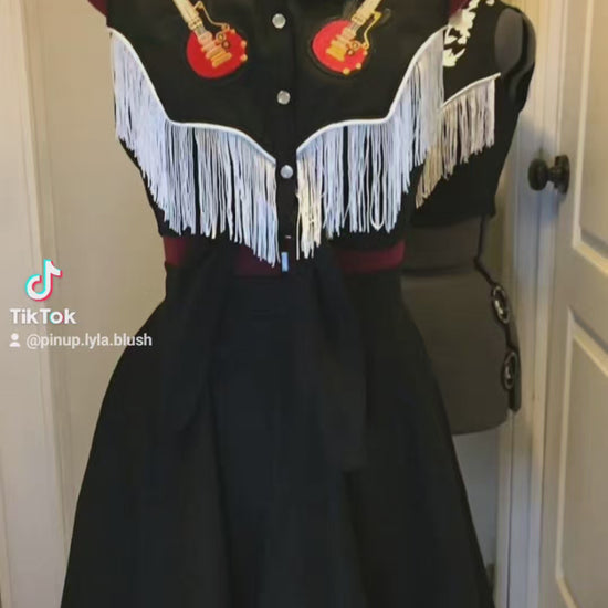 These are custom, two-piece outfits that fuse the classic Western snap-shirt with a flattering vintage swing skirt silhouette. The collection is defined by its bold use of color, intricate embroidered motifs (especially roses), and dramatic fringe detailing on the yokes and sometimes hemlines, offering a fierce, glamorous take on cowgirl style.