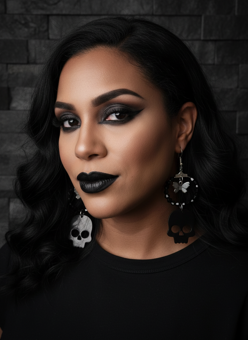 A must-have for an edgy or 'Cute Goth' look. These statement hoops are made with hand-strung black spinel-colored crystal beads for maximum brilliance. They feature a stylized, reflective black resin skull charm dangling below a bright, sculpted butterfly charm. Lightweight and darkly glamorous, these earrings are designed to make a dramatic statement while remaining comfortable for all-day wear