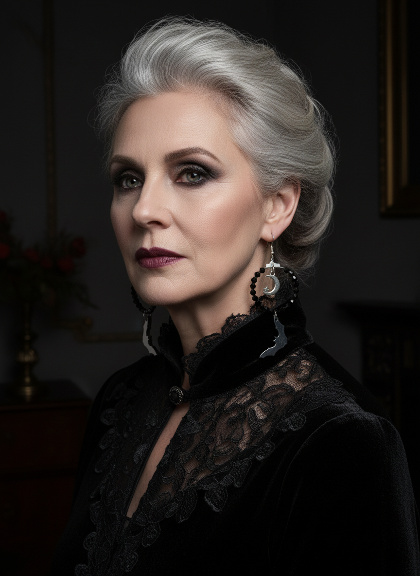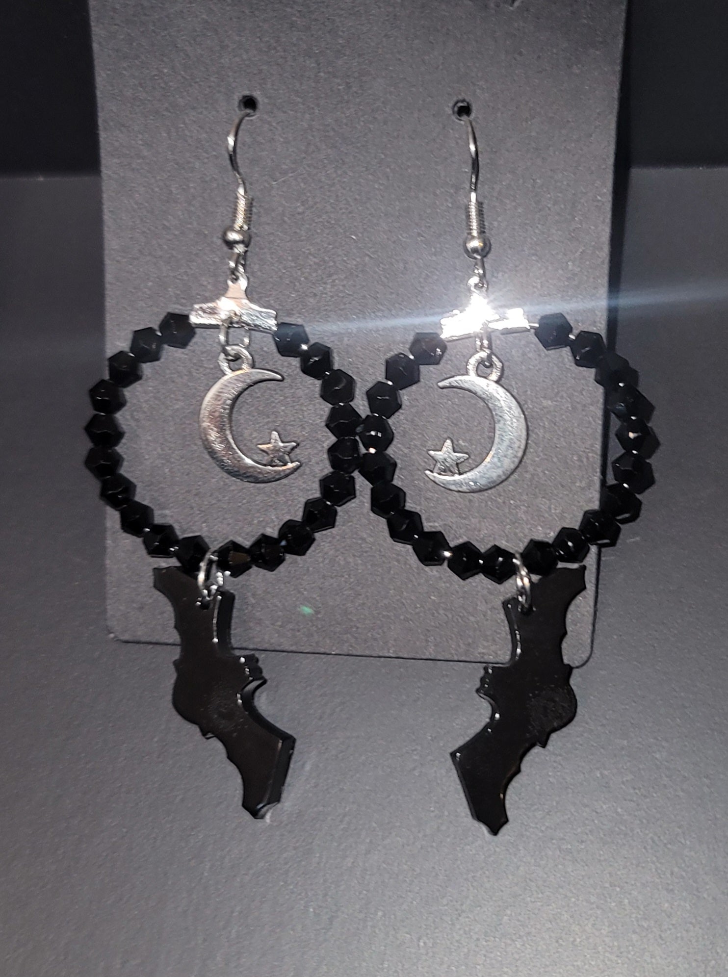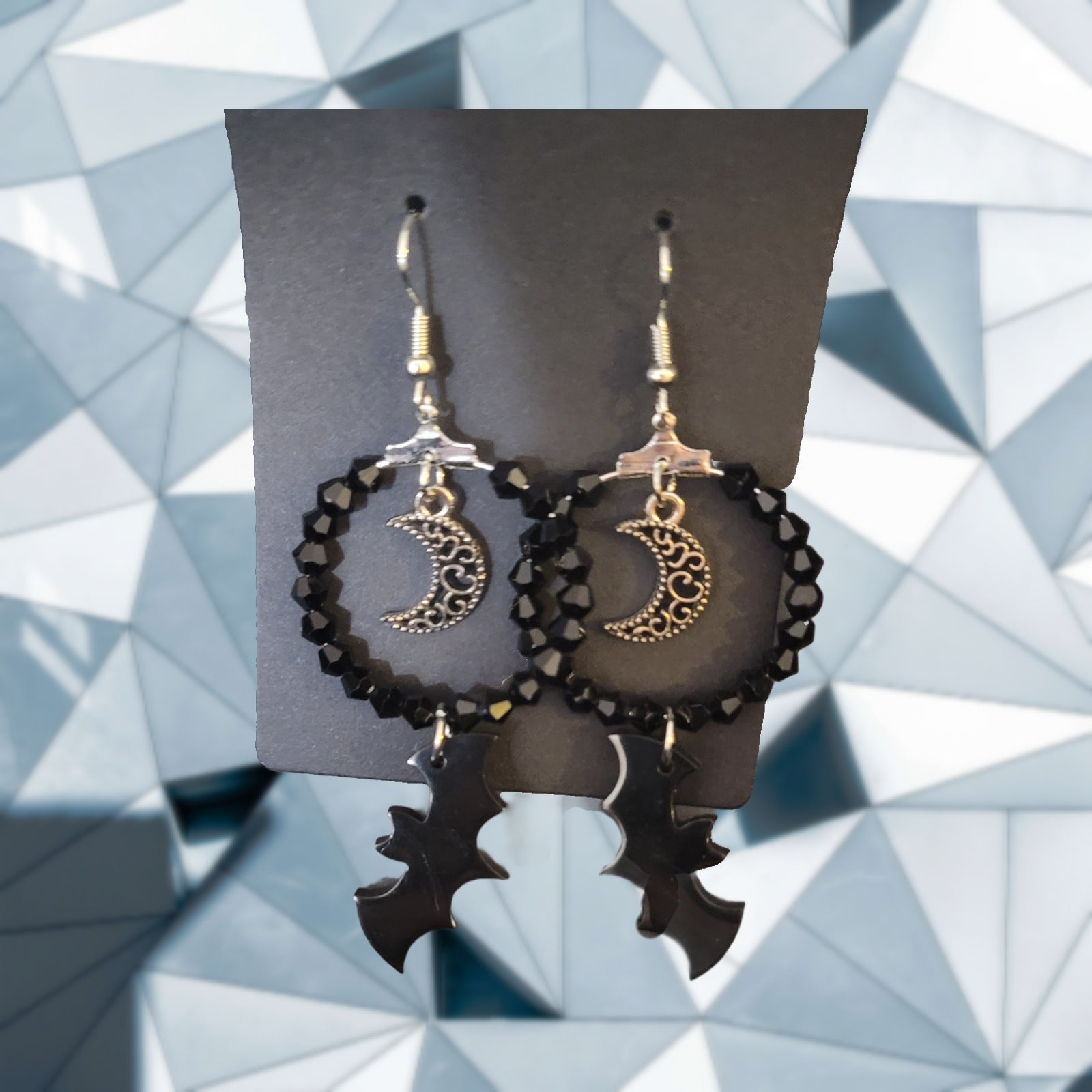 Hand-wired hoops featuring deep black, faceted crystal beads that reflect the light for a truly dark, dramatic look. Each earring is adorned with an ornate silver filigree crescent moon charm and a sleek, glossy resin bat charm dangling below. These pieces embody the mystery of the night, perfect for adding a touch of Gothic elegance or dark romance to any outfit
