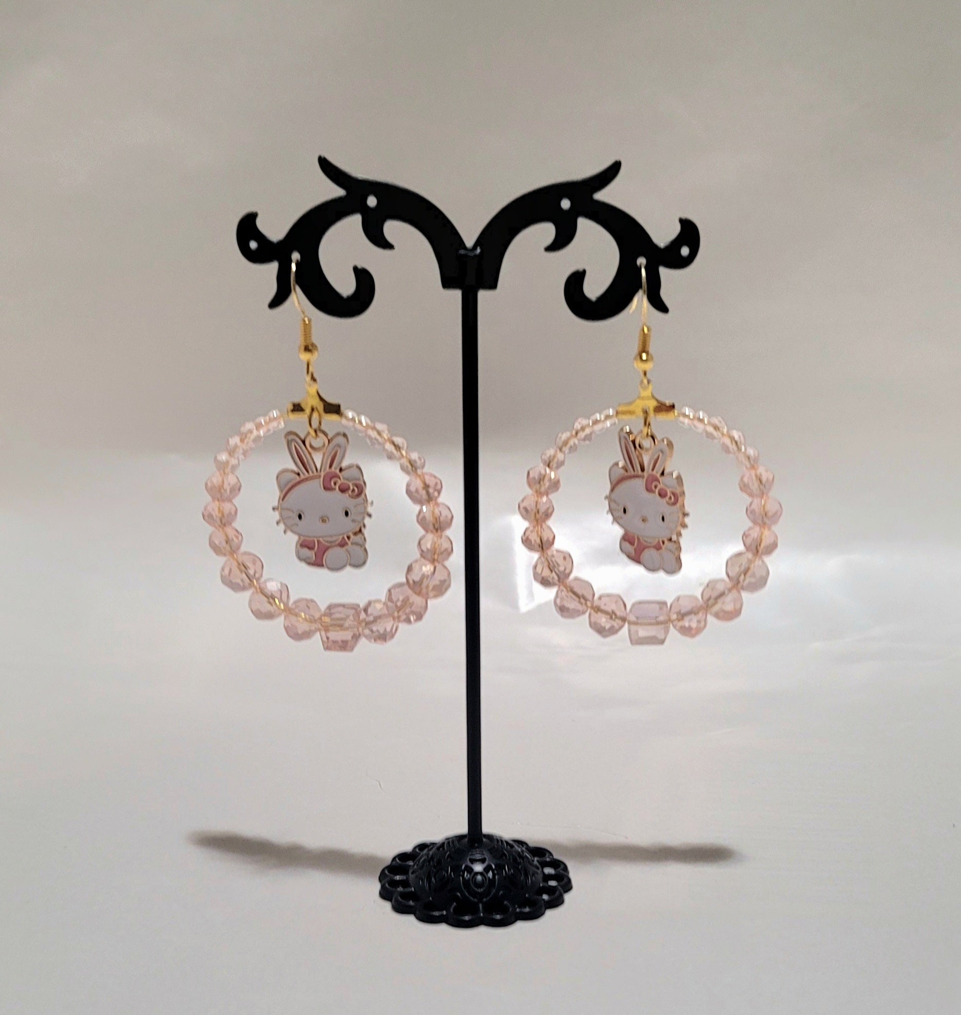 ✨ Sweet Whimsy: Pink Beaded Bunny Dangle Hoops with faceted pale pink crystal/glass beads, strung on a wire hoop.