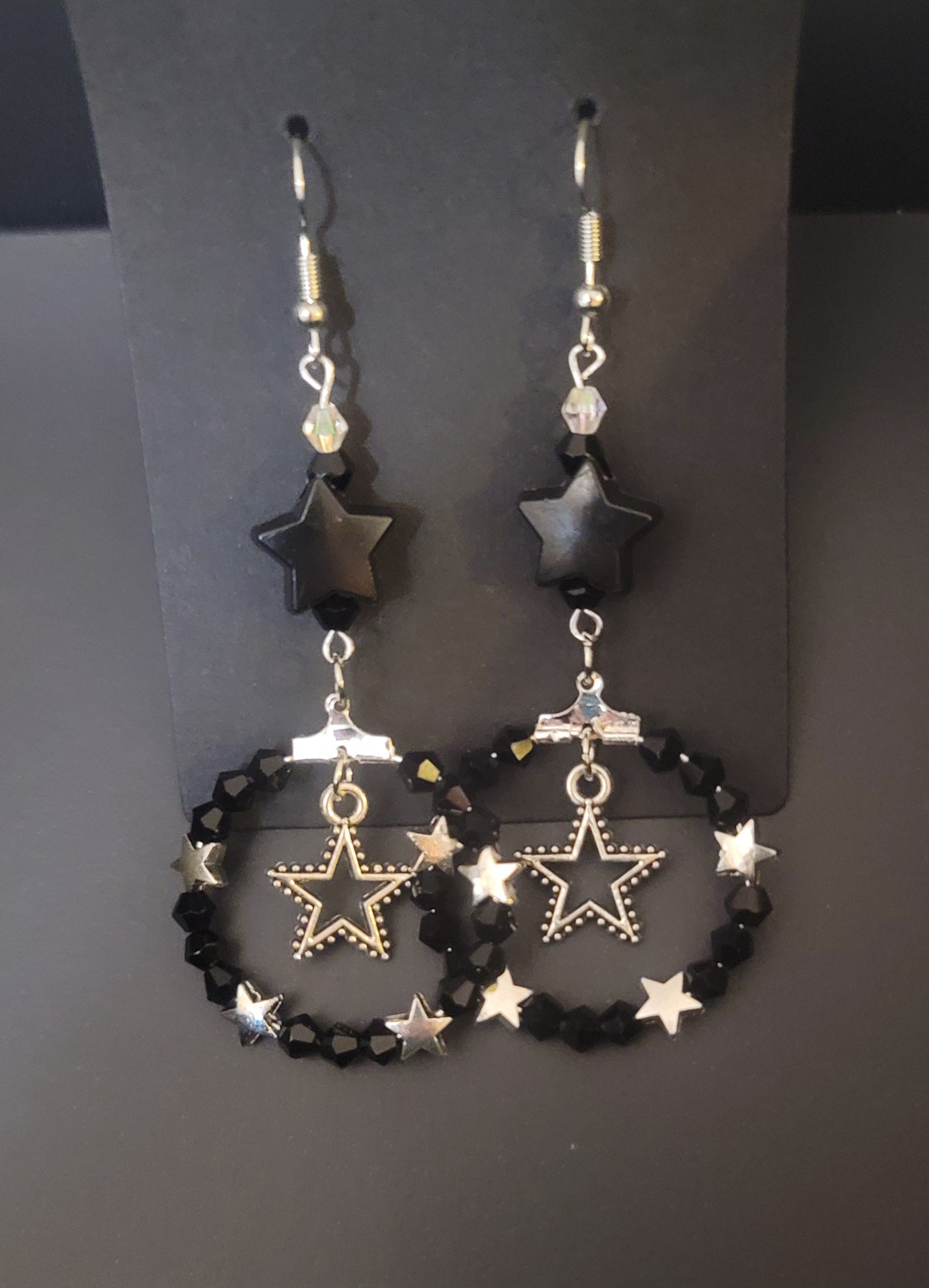 A study in texture and shine. These earrings combine the high-gloss sparkle of faceted black crystal beads with the soft, flat finish of the matte black star bead at the top. The hoop is adorned with various silver-toned star charms—including a flat outline pendant and chunky solid accents—providing a high-contrast flash against the dark beads. This careful balance of components makes for an intricate and engaging accessory.
