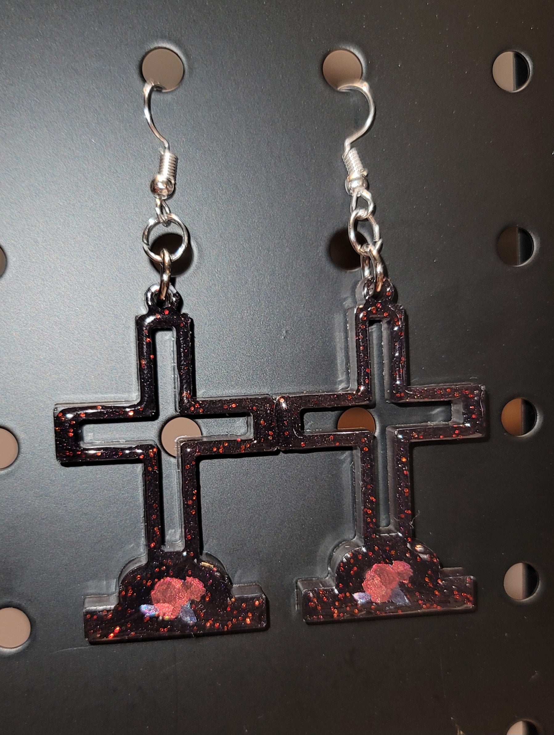 Gothic Graveyard Glimmer: Each pair is a unique, hand-poured resin tableau, capturing skulls, cobwebs, crucifix, and spiders in a dark crystalline, eternal moment. The dark resin and red glitter magnifies the intricate details of each theme creating pieces that feel both delicate and defiantly dark. Size of each are 2" tall not counting the earring hooks.